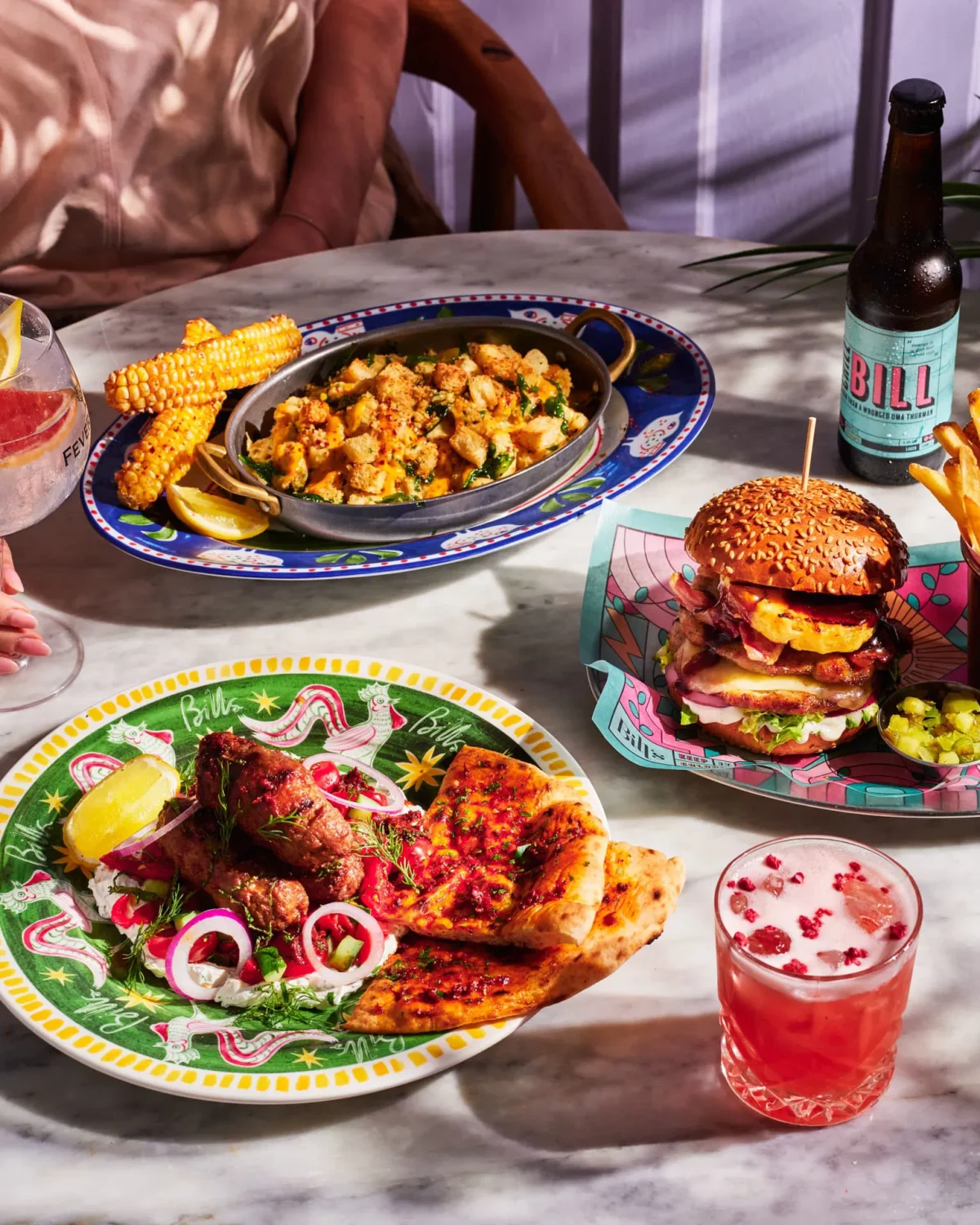 Perfect for group dining, the sharing mains are also a hit. The vegetarian option includes chilli honey halloumi, roast squash hummus, chilli corn ribs, tzatziki, flatbread, pickles and olives. Bill’s Classic adds hot honey chorizo and chicken and sesame dumplings, while the seafood platter features smoked salmon pâté, breaded calamari, cod goujons, basil aioli and flatbread.